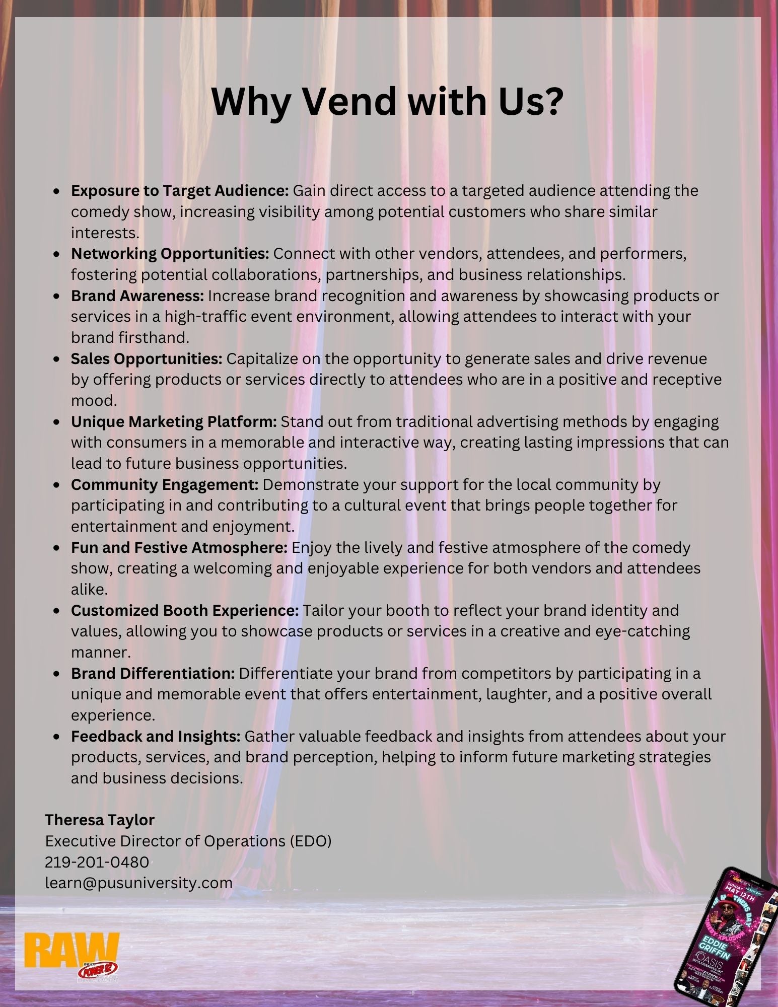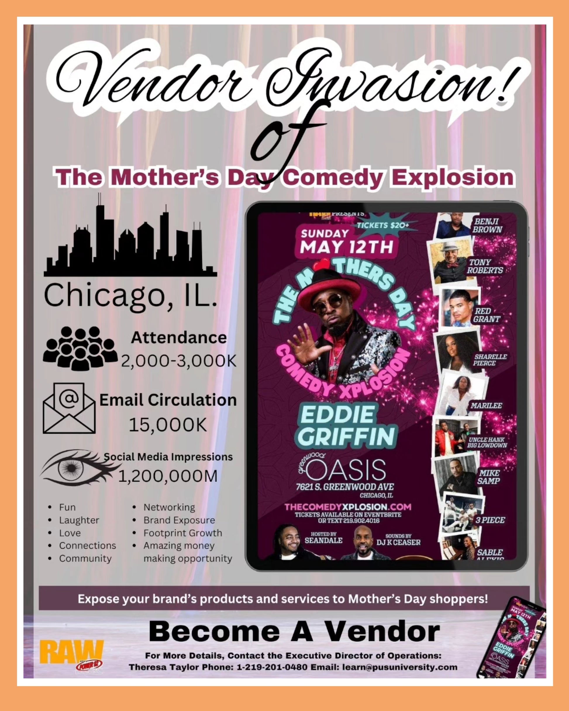 We are taking over the Mother's Day Comedy Explosion in Chicago! Come grow your client and customer footprint at The Annual Mother's Day Comedy Explosion. With almost 3,000 guests in appearance, we are presenting to you an amazing opportunity to connect with new customers and expand your brand's reach and awareness! This will be the perfect event to showcase your Mother's Day sale items, grow your email list, and generate revenue for your business! There are limited spots available for this pop-up shop opportunity. Your vending booth is accompanied by an on-air radio interview with Raw Radio Power92 to promote your brand to the masses of the Chicagoland area. Promotional Flyer will be issued within 48hrs of payment received.